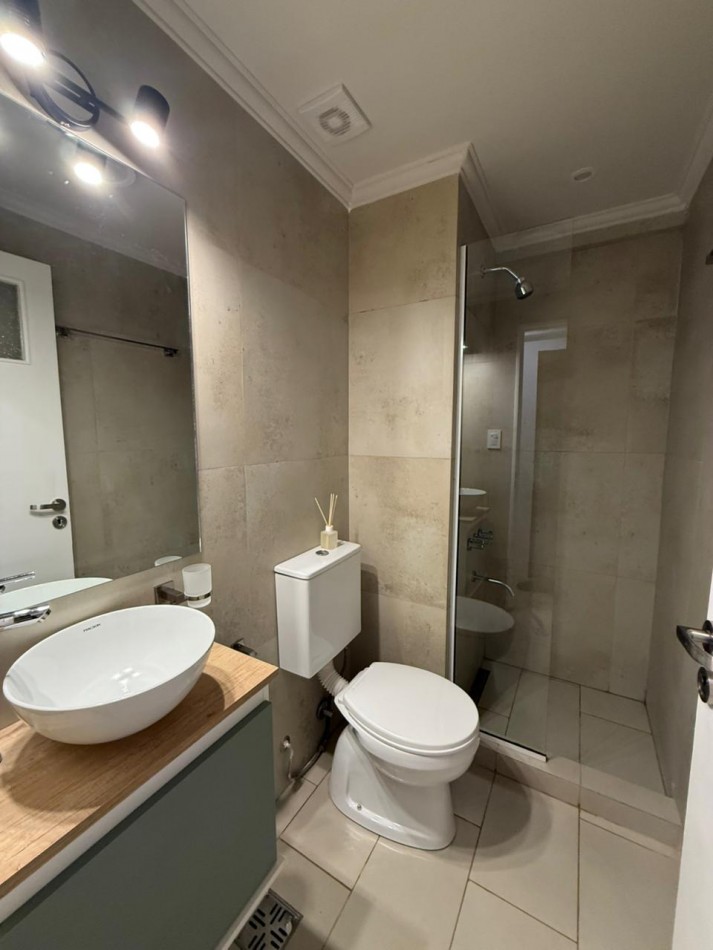 Cocina semi integrada, con barra desayunadora y muebles a medida. Equipada con artefacto de cocina, microondas, heladera con freezer y lavarropas instalado.