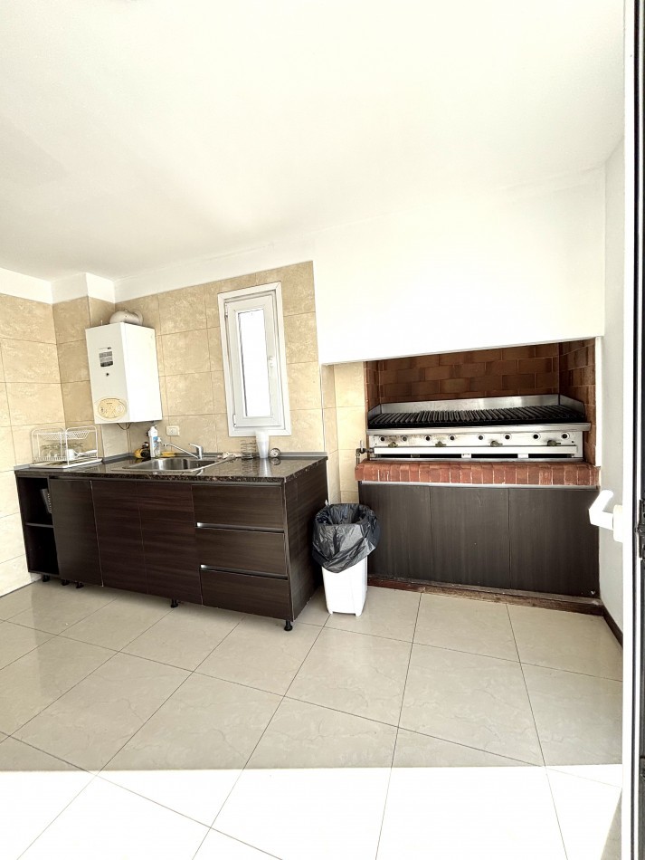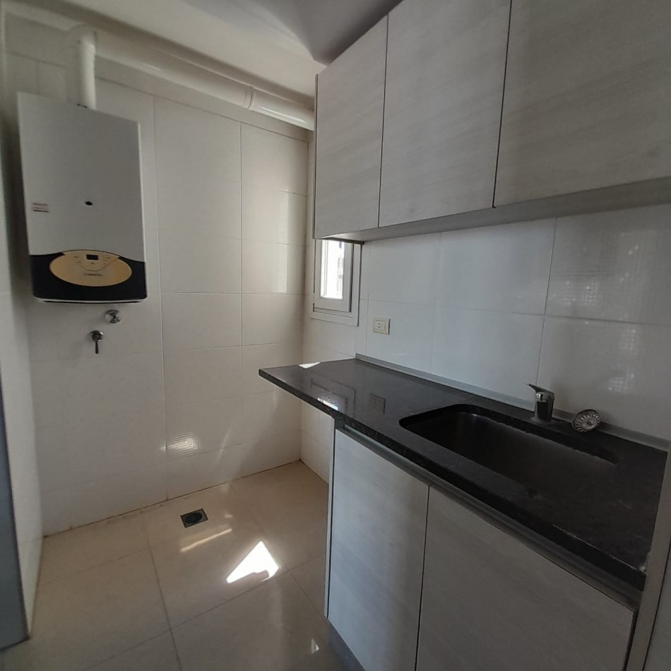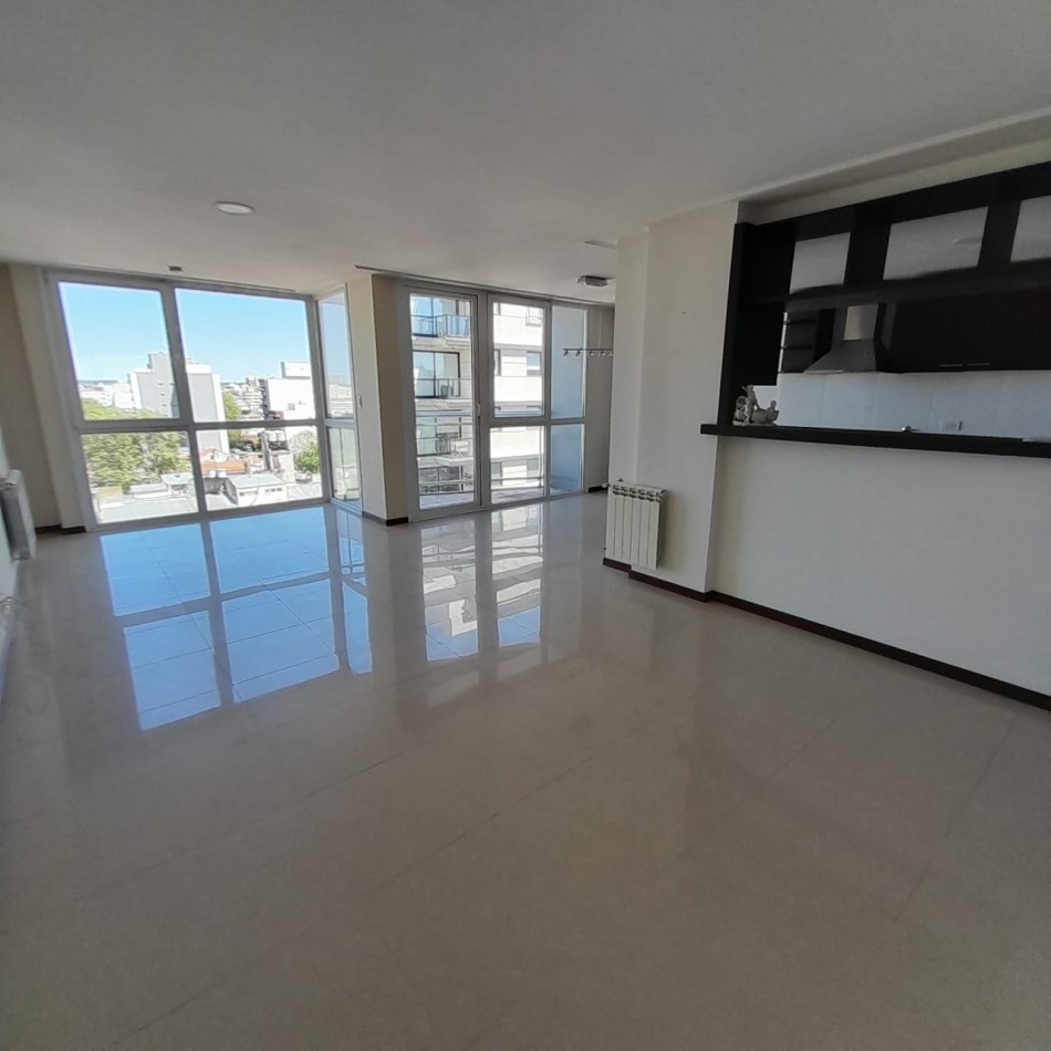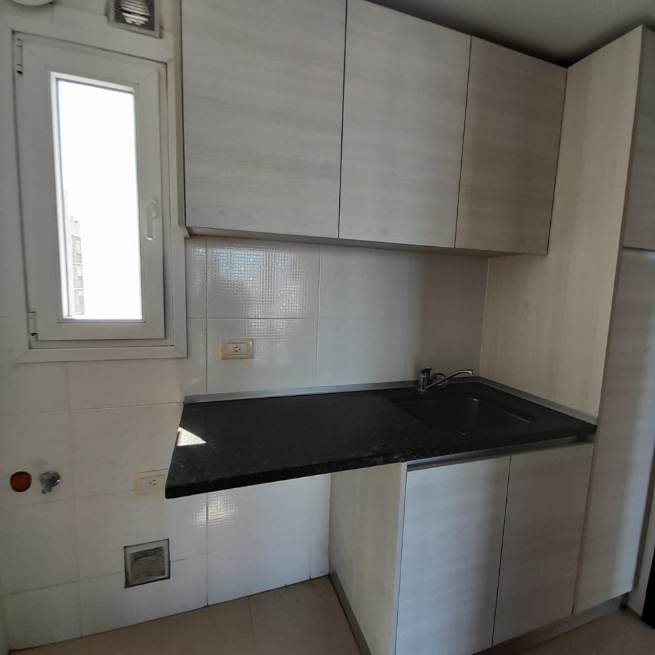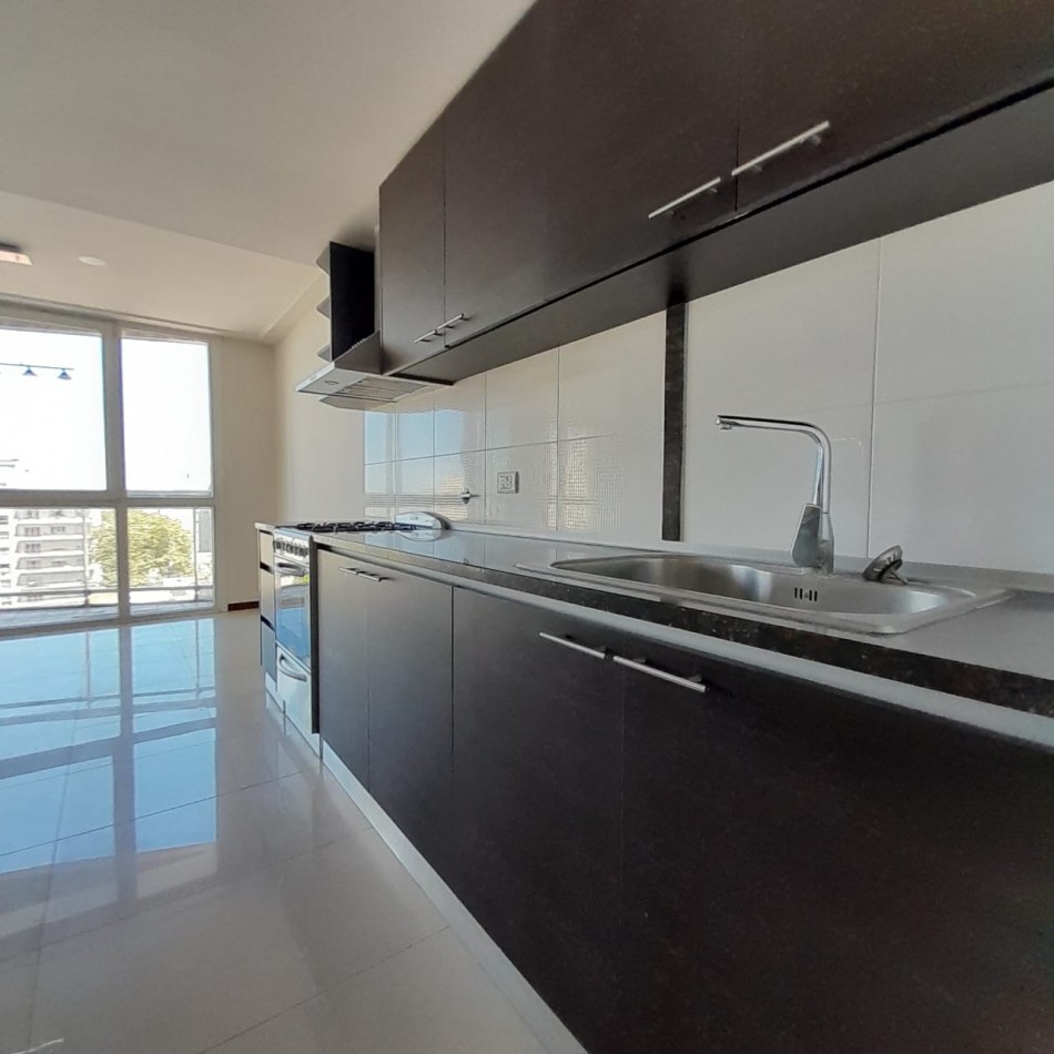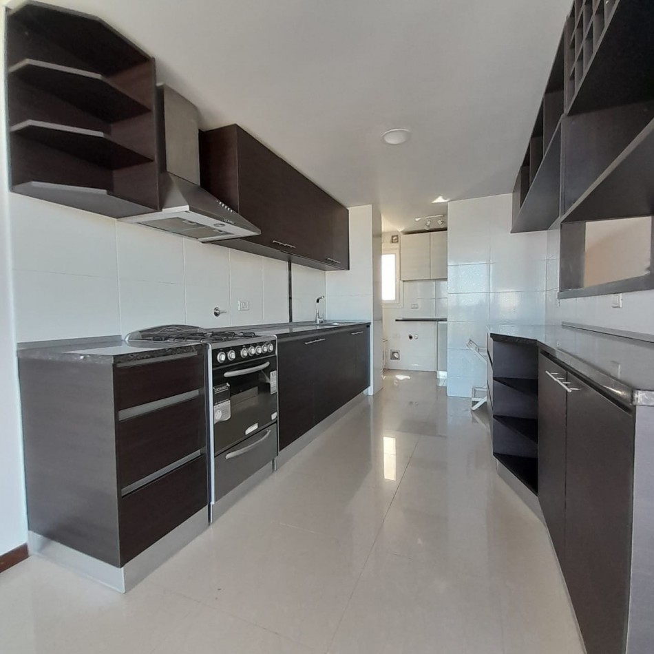 Cocina semi integrada, con barra y pasa platos hacia el comedor principal, y abierta hacia un espacio de comedor diario, que da hacia el balcón al frente. Es una cocina muy amplia, cómoda y luminosa, con doble mesada, muebles a medida sobre y bajo mesada que proporcionan gran lugar de guardado, cocina y campana de extracción de olores en acero inoxidable.