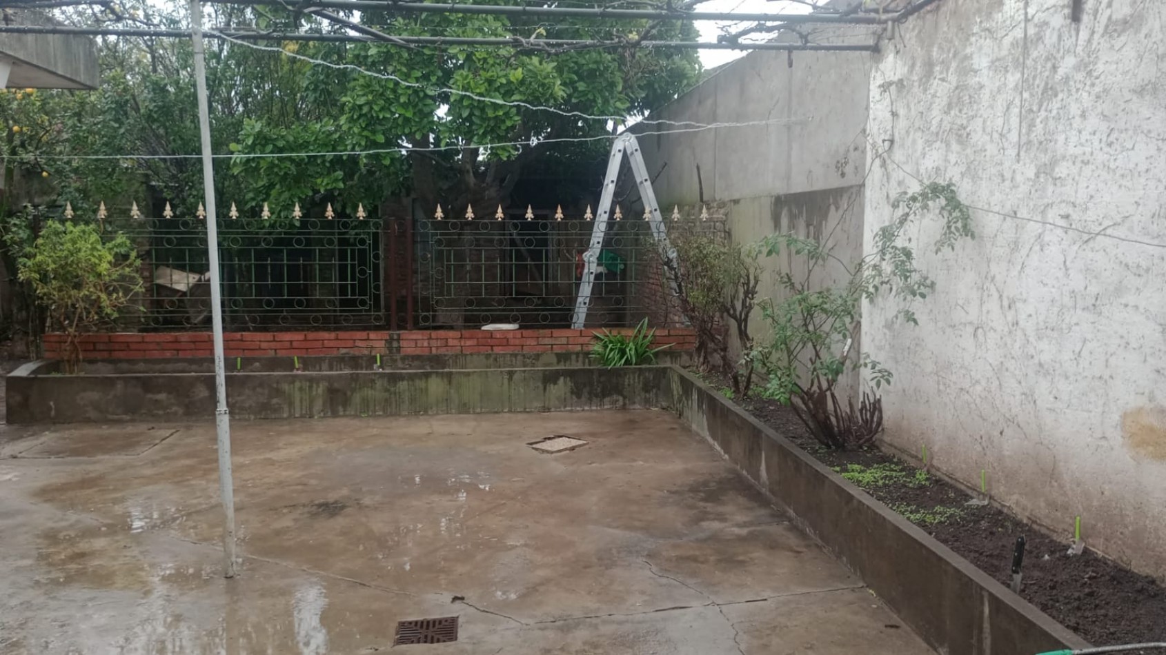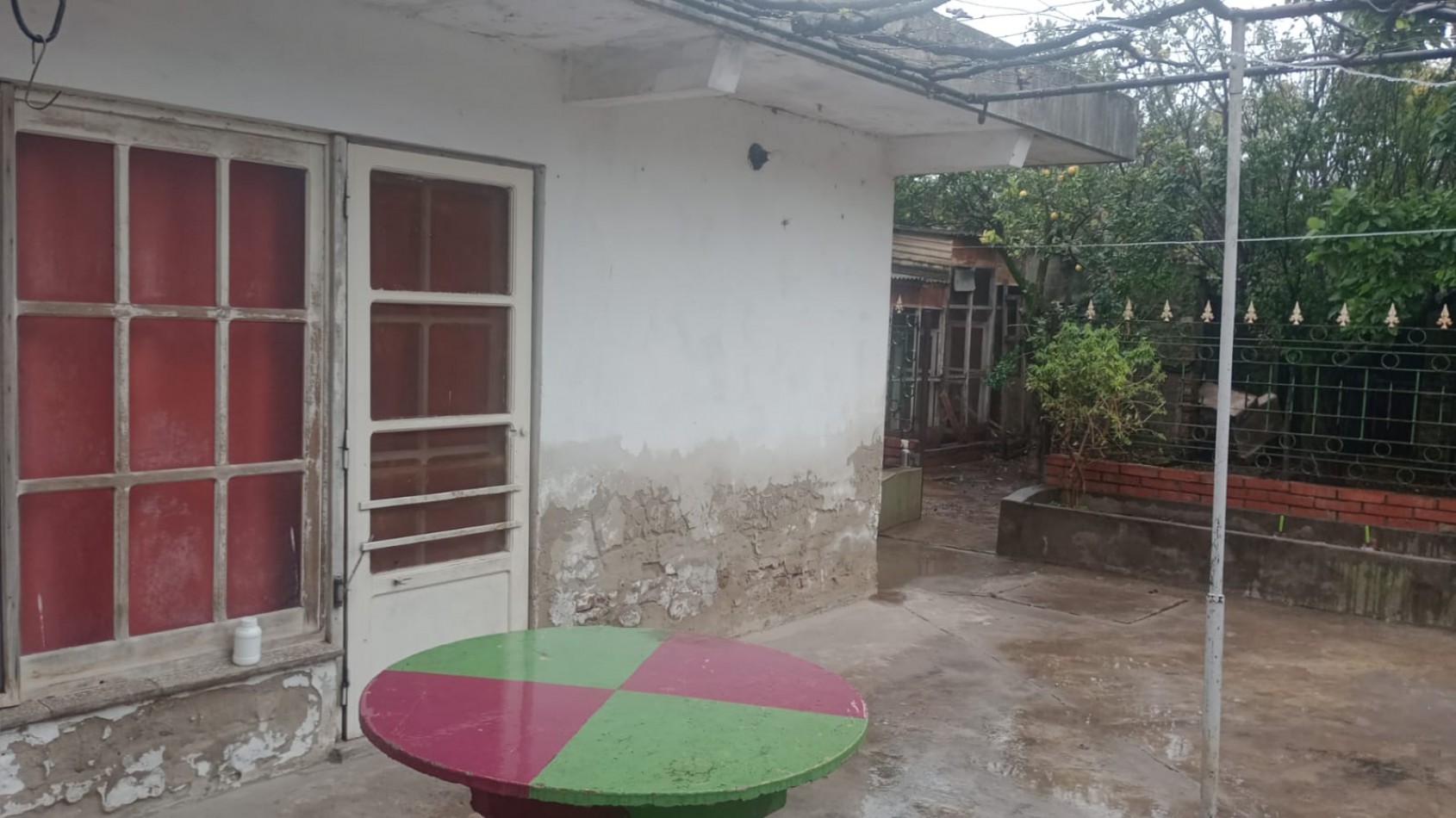 Patio interno pequeño con piso de cemento y parque atrás con frutales.