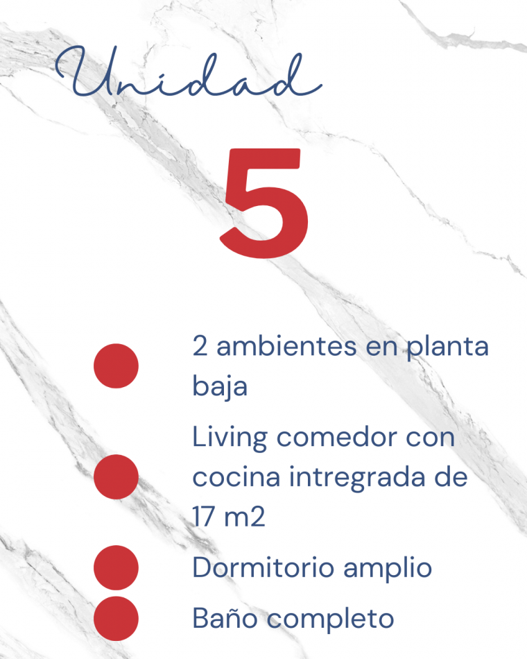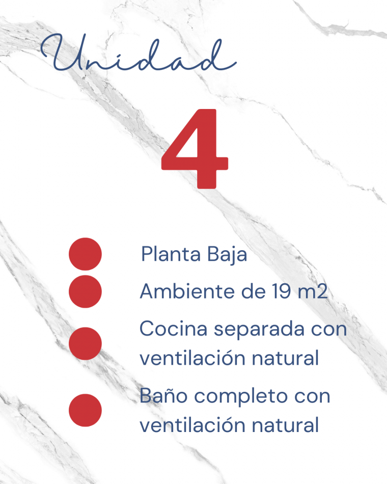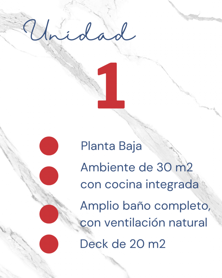 Cada unidad comprende un ambiente integrado (de distintas dimensiones dependiendo de la unidad), cocina equipada, baño completo y deck o terraza.