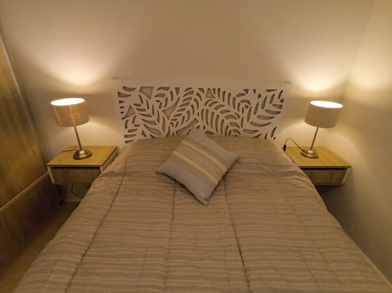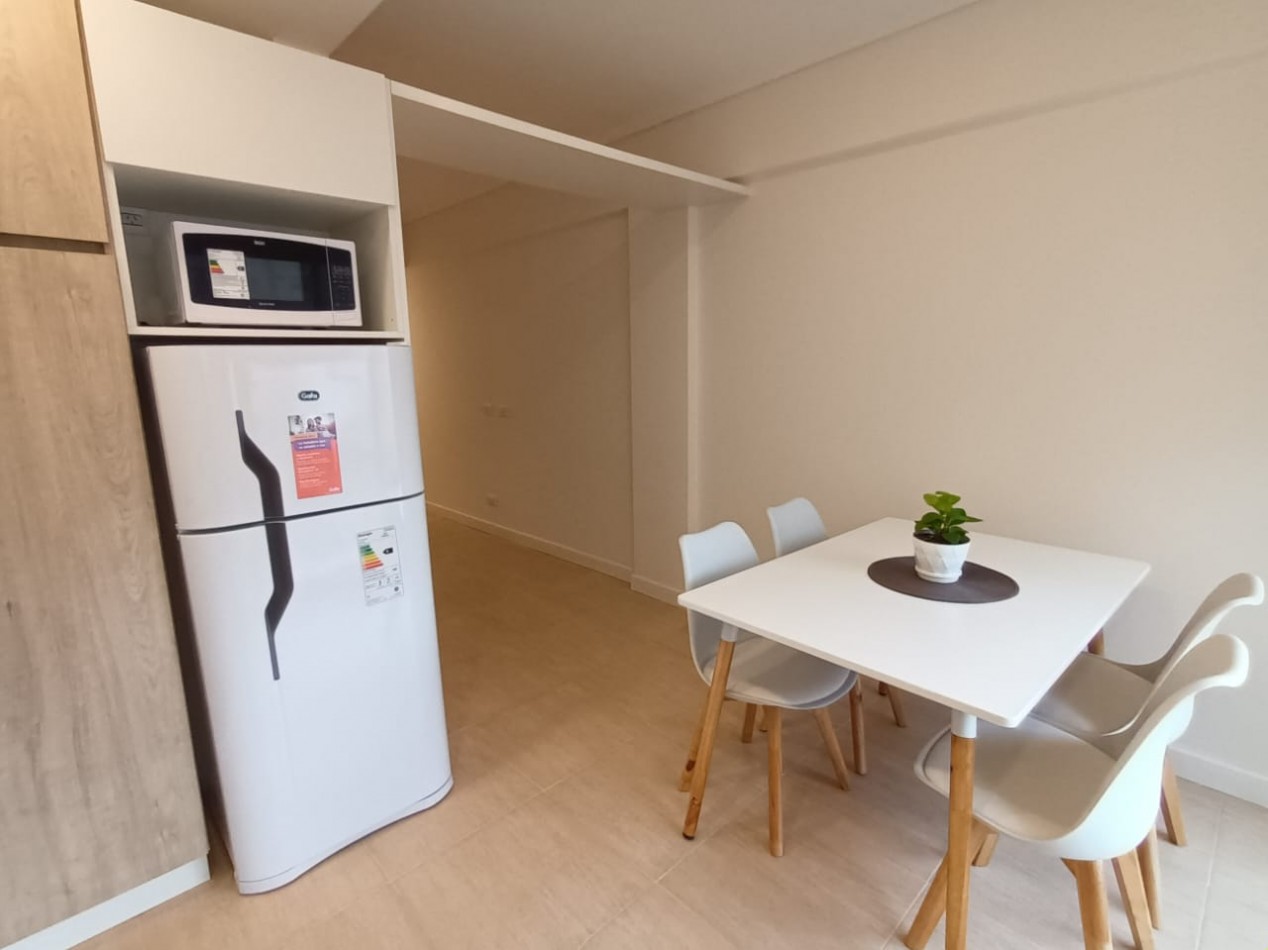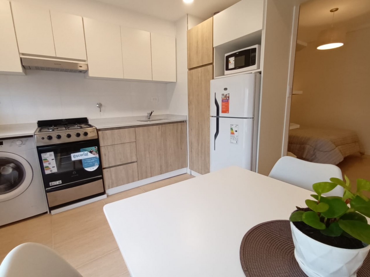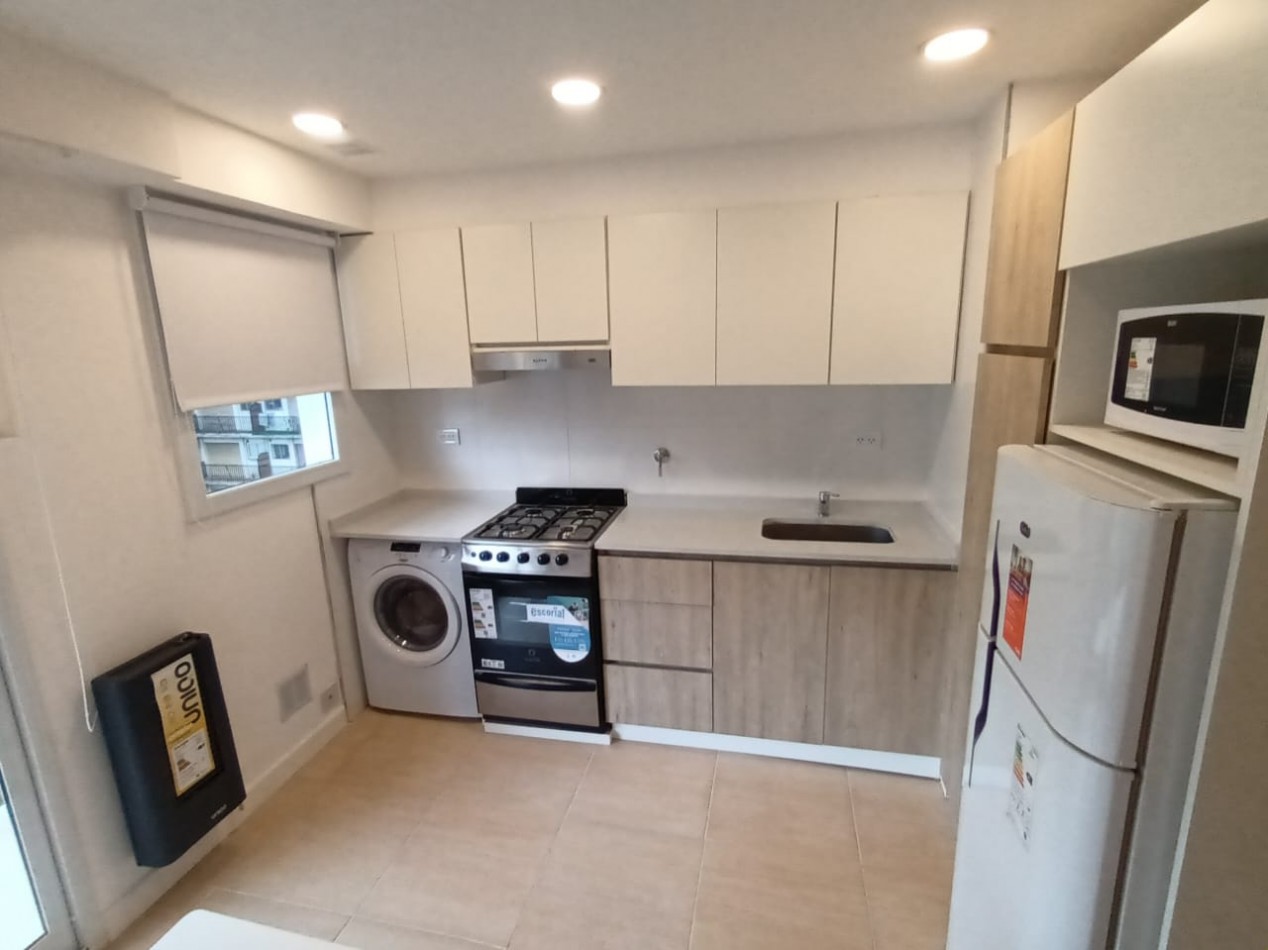 Cocina integrada, con muebles a medida y ventilación natural. Equipada con artefacto de cocina, campana de extracción de olores, heladera con freezer, microondas y lavarropas instalado.