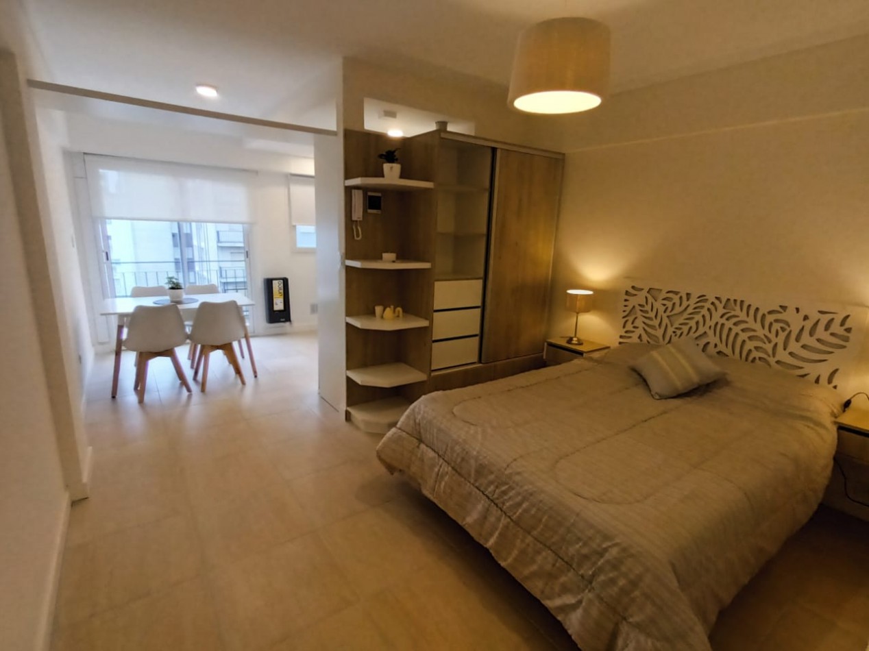 Ambiente dividido, con ventanal al frente, balcón saliente y calefactor tiro balanceado.