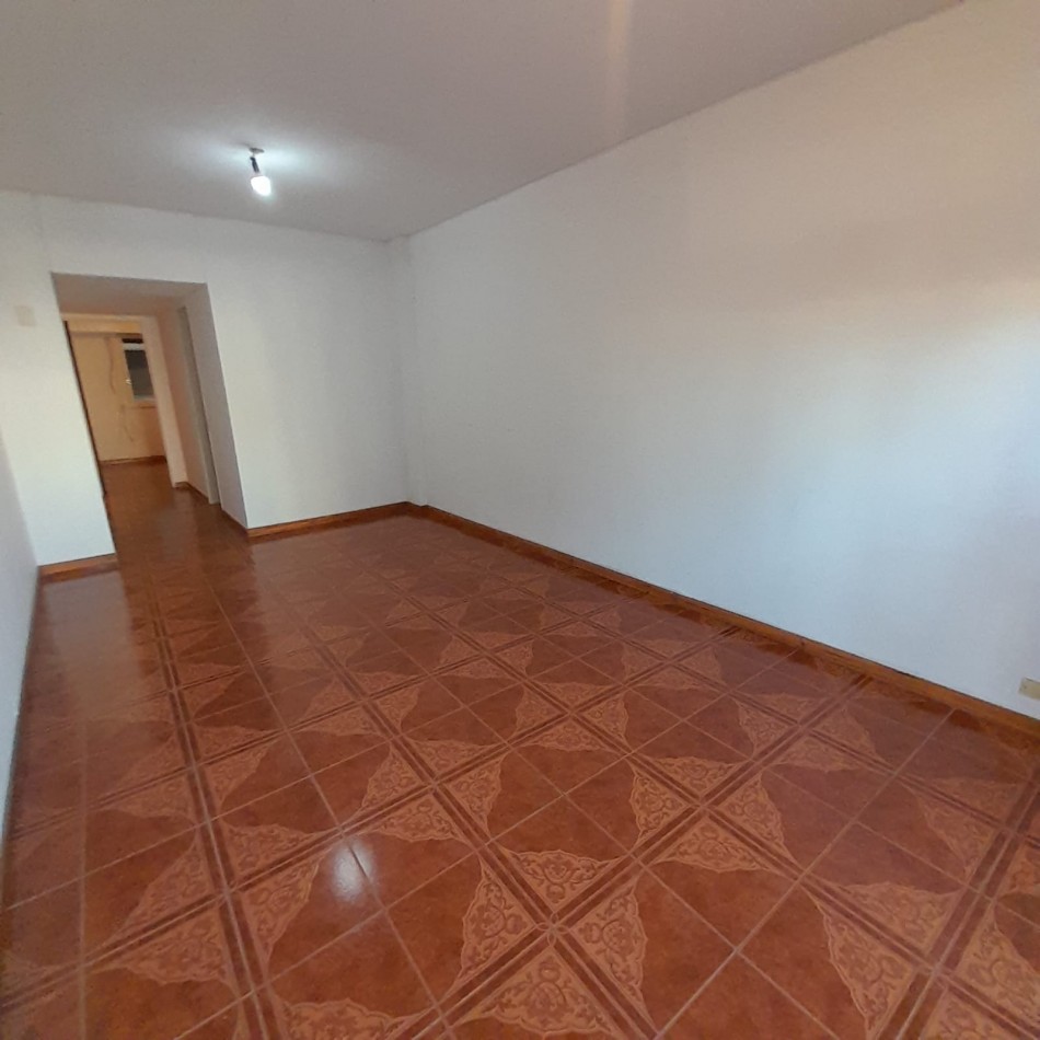 Living comedor con piso de cerámicos, amplio ventanal y balcón a la calle.