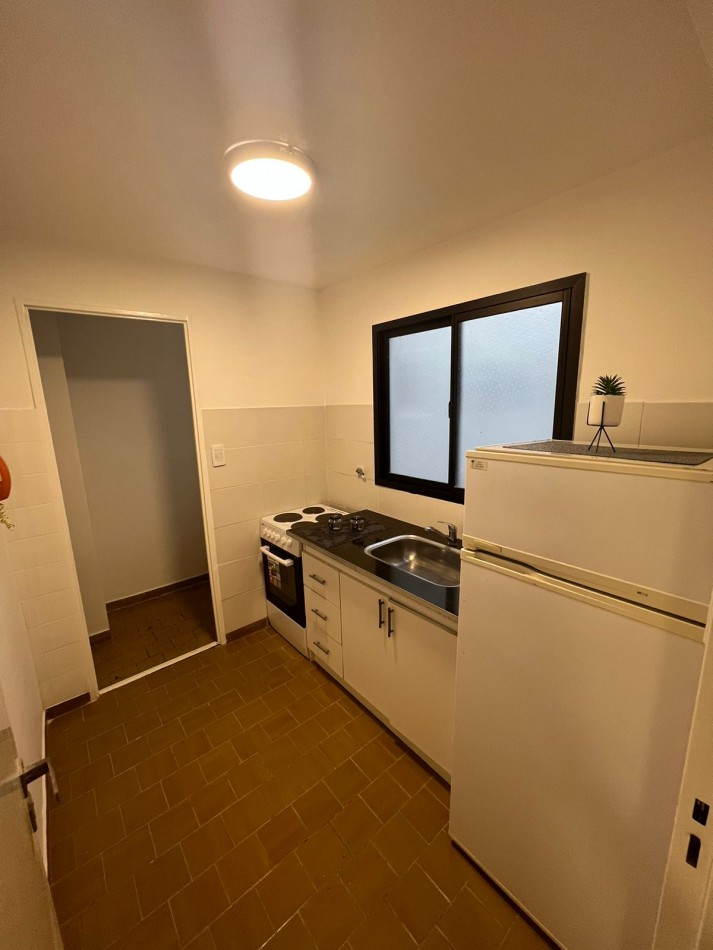 Cocina separada, con ventilación natural y revestida en cerámicos, equipada con cocina eléctrica y heladera con freezer.