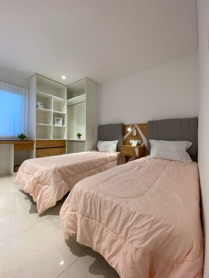 Segundo dormitorio al contrafrente, con piso de porcelanatos, placard a medida y espacio de escritorio con mueble.