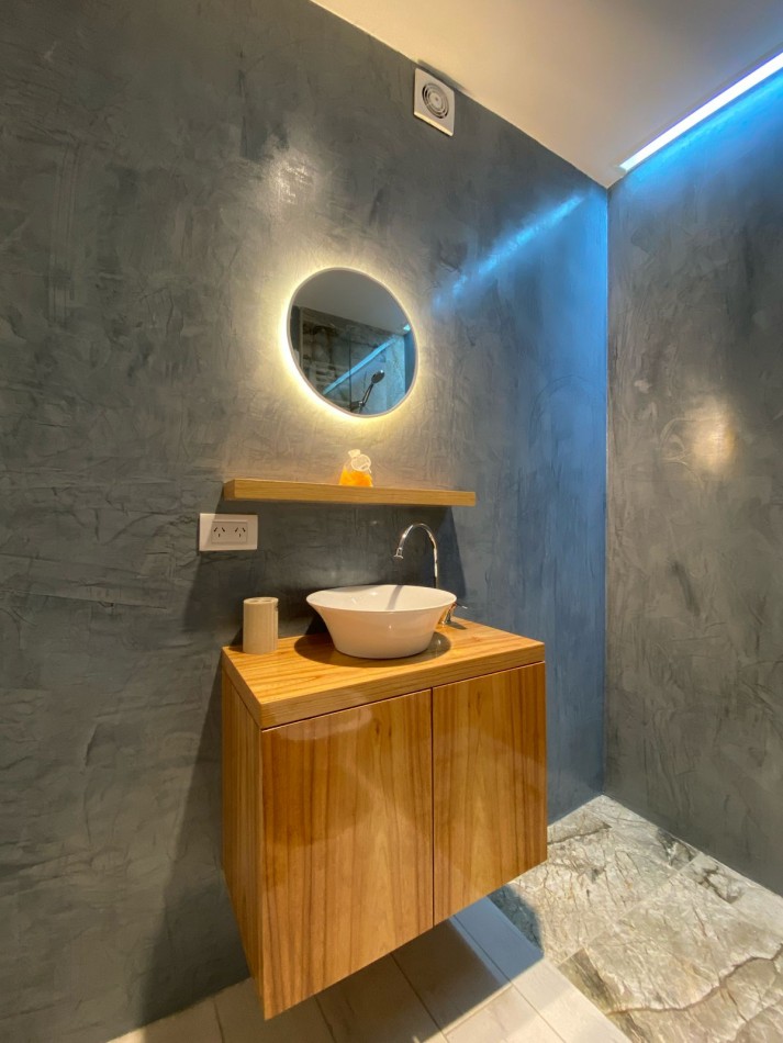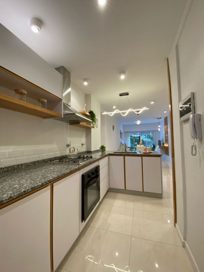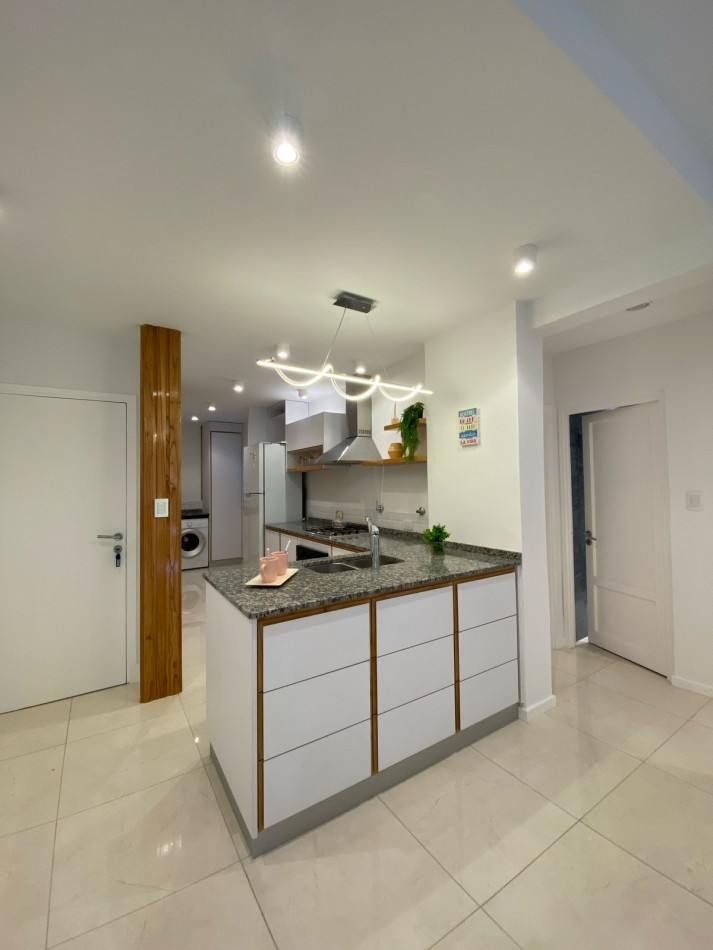 Cocina integrada, con ventilación natural y muebles a medida. Equipada con anafe, horno empotrado y heladera con freezer. Zona de lavadero incorporada, con lavarropas instalado y mueble de guardado.