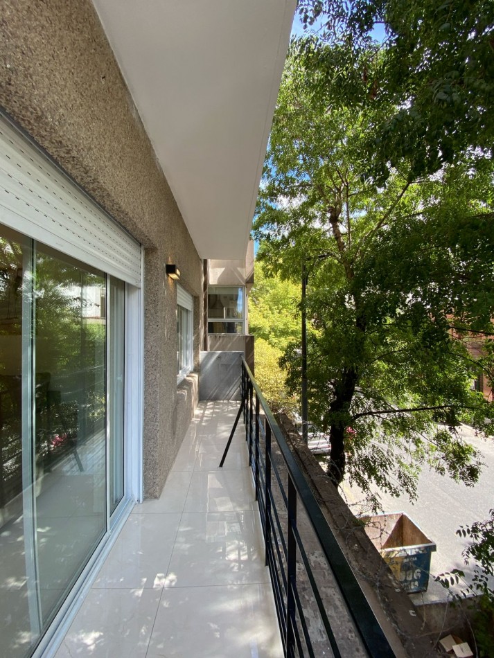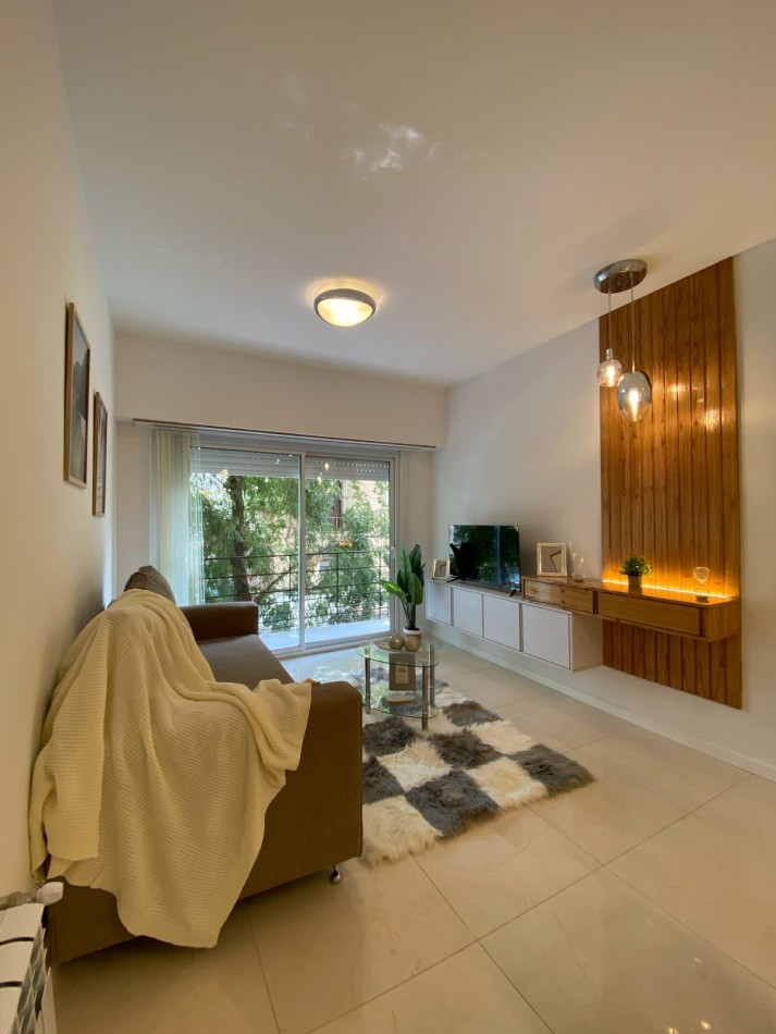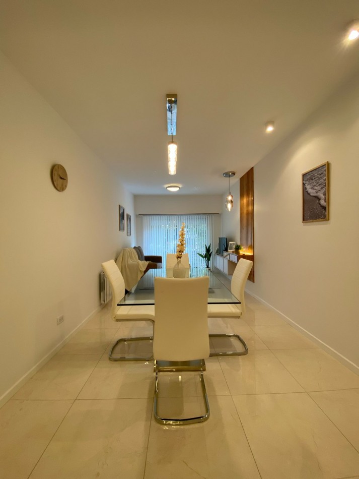 Living comedor al frente y muy luminoso, con piso de porcelanatos y amplio ventanal con salida al balcón corrido.