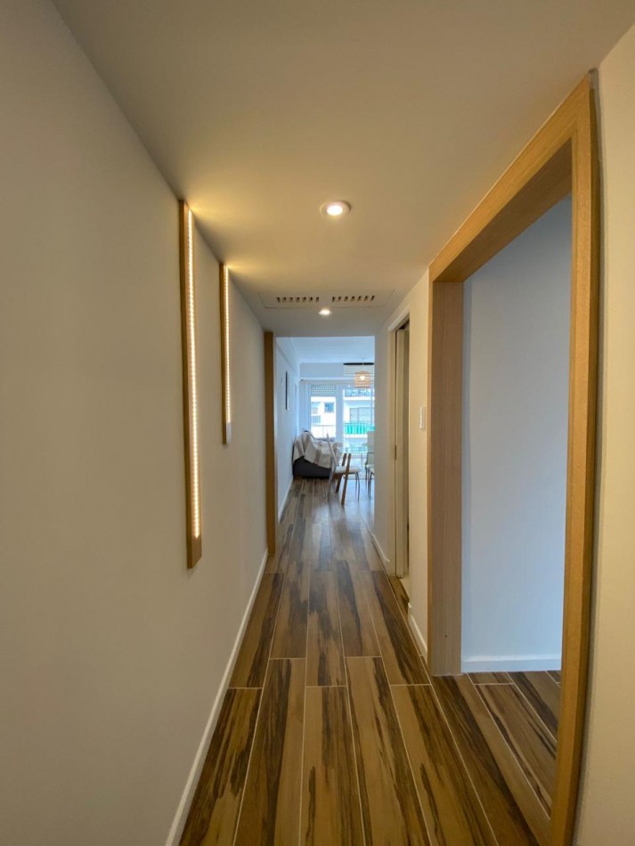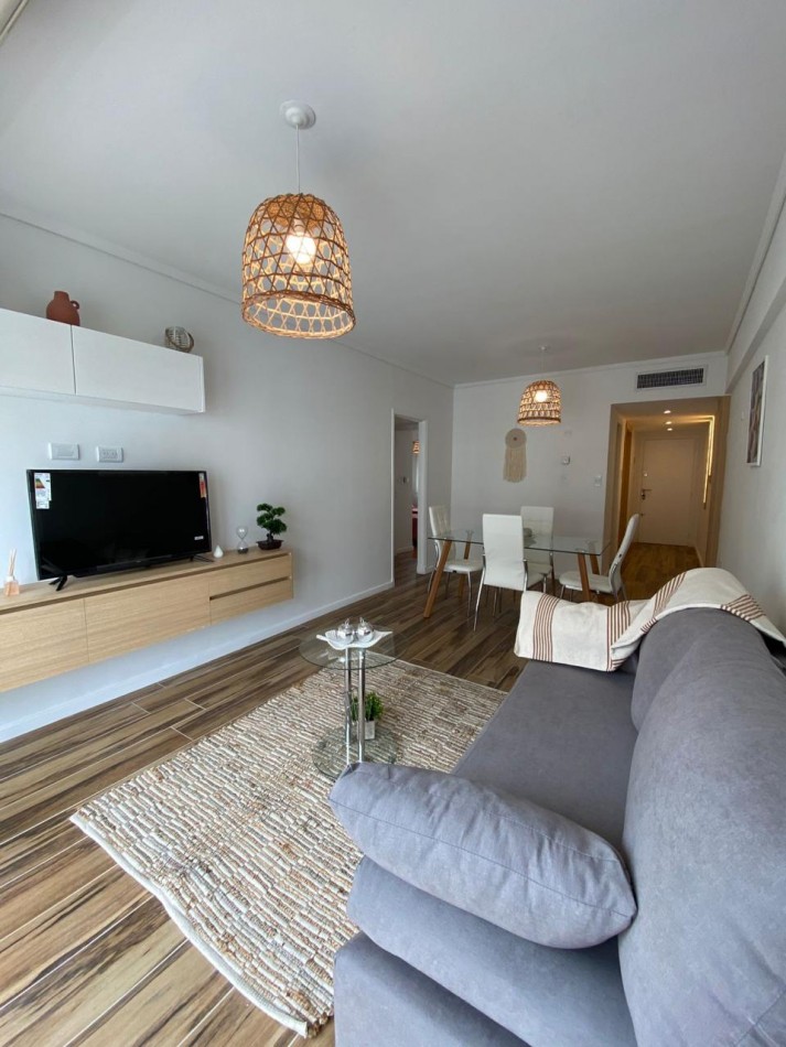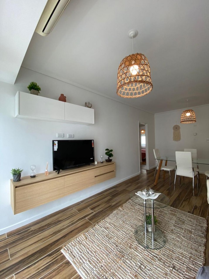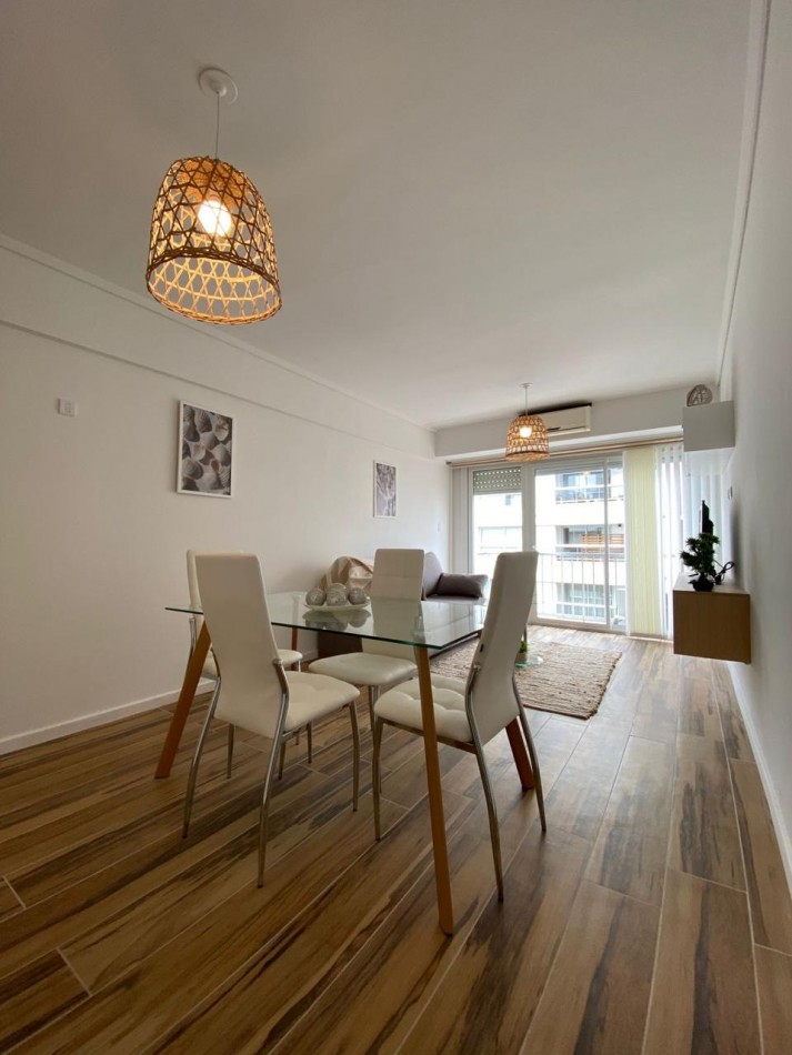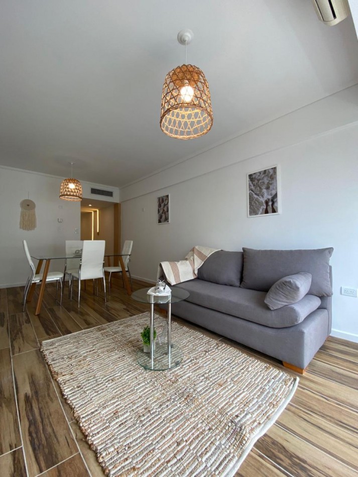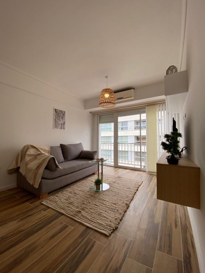 Living comedor amplio, al frente y muy luminoso, con aire acondicionado y ventanal con puerta ventana hacia el balcón.