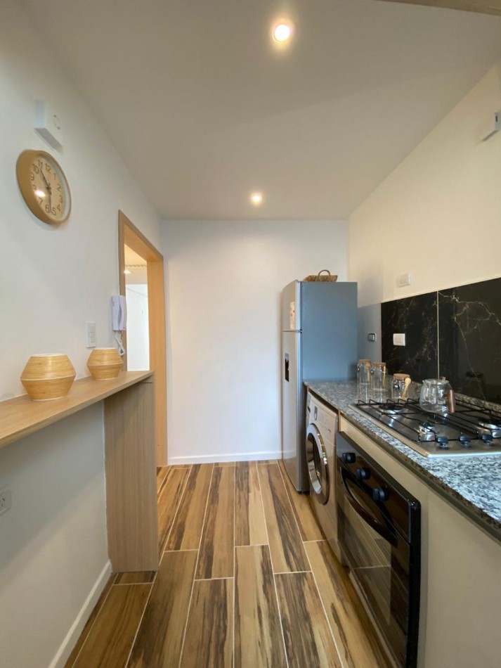 Cocina separada, con ventilación natural y muebles a medida. Equipada con anafe, horno empotrado, heladera con freezer y lavarropas instalado.