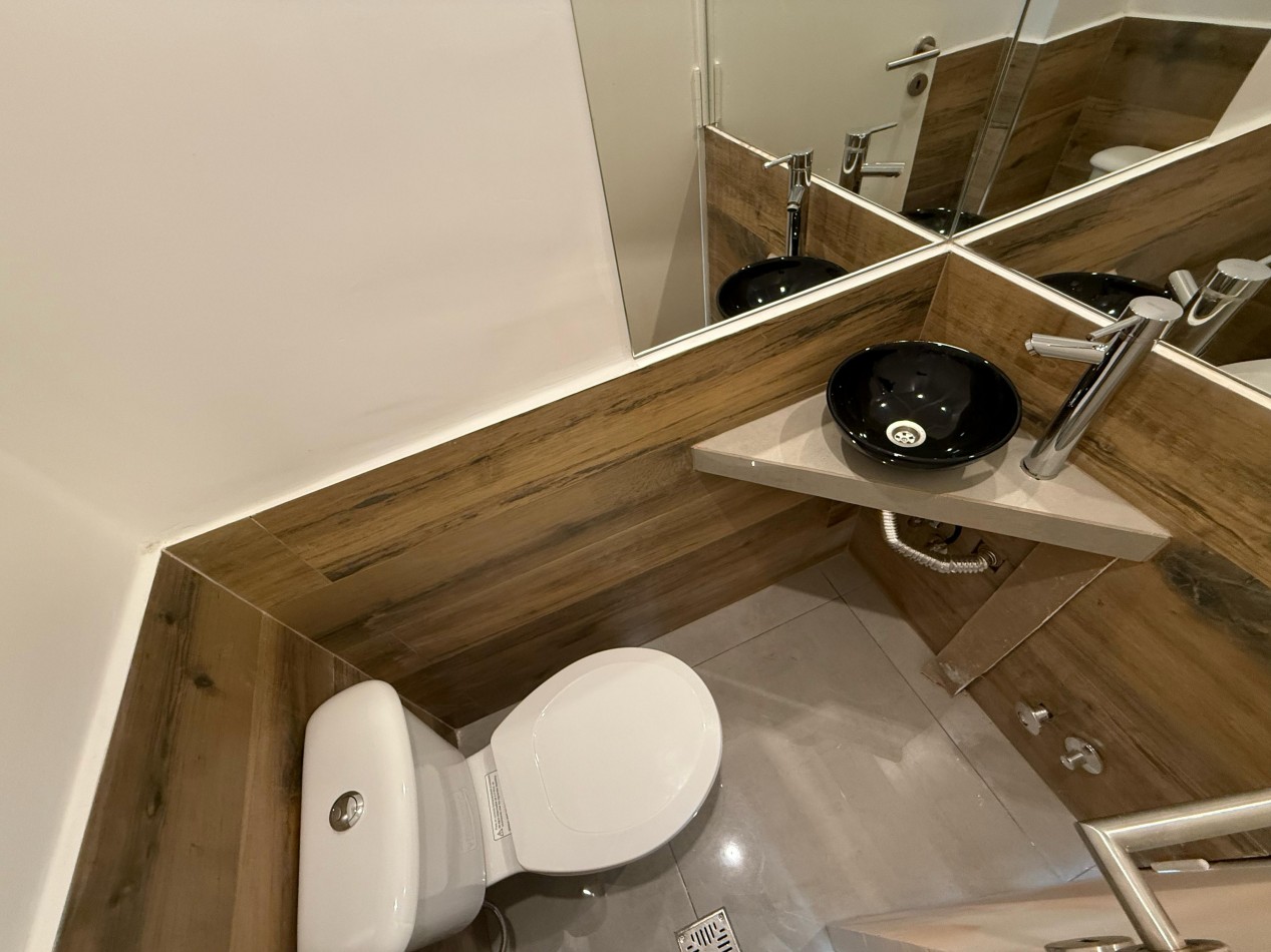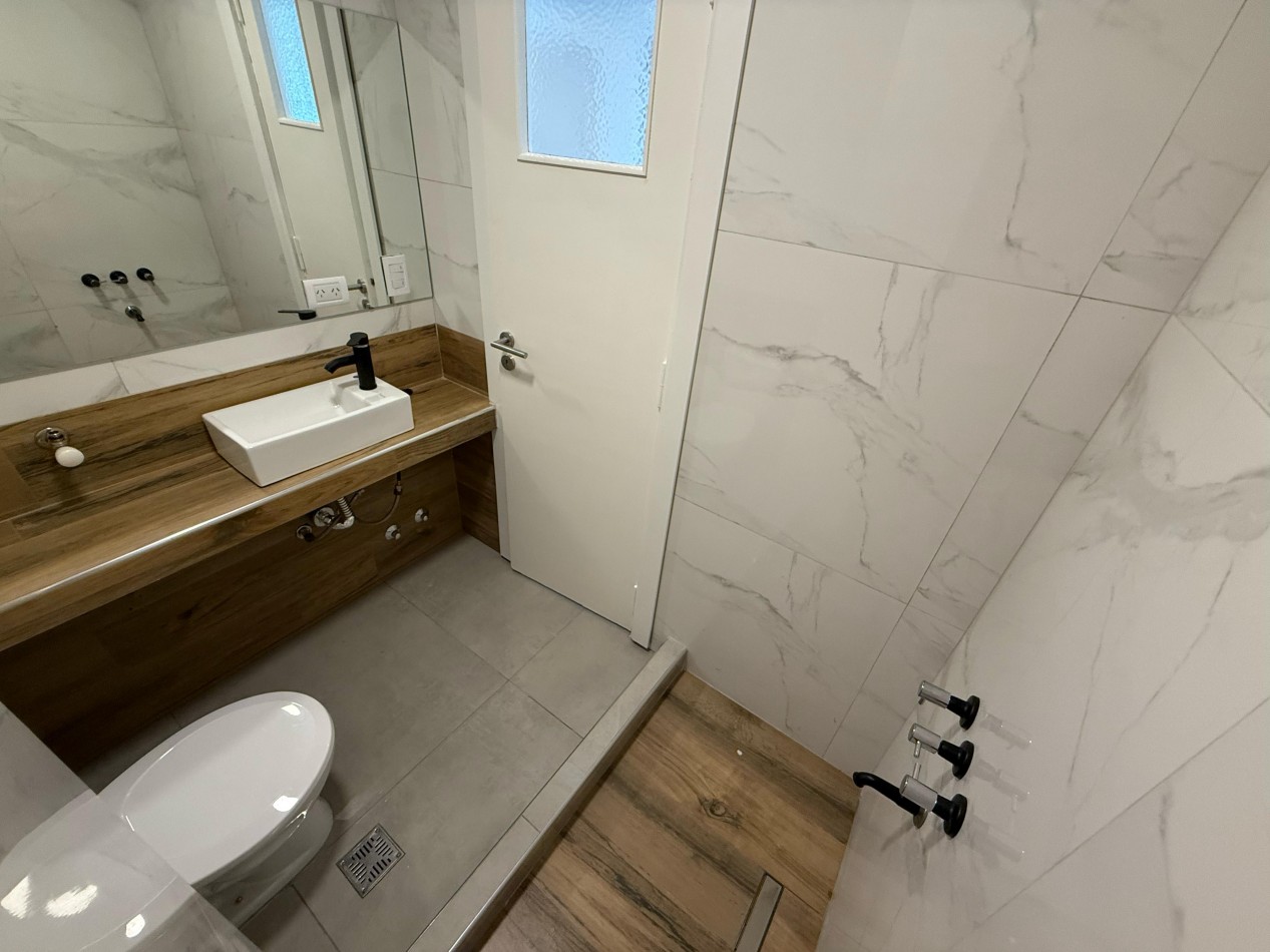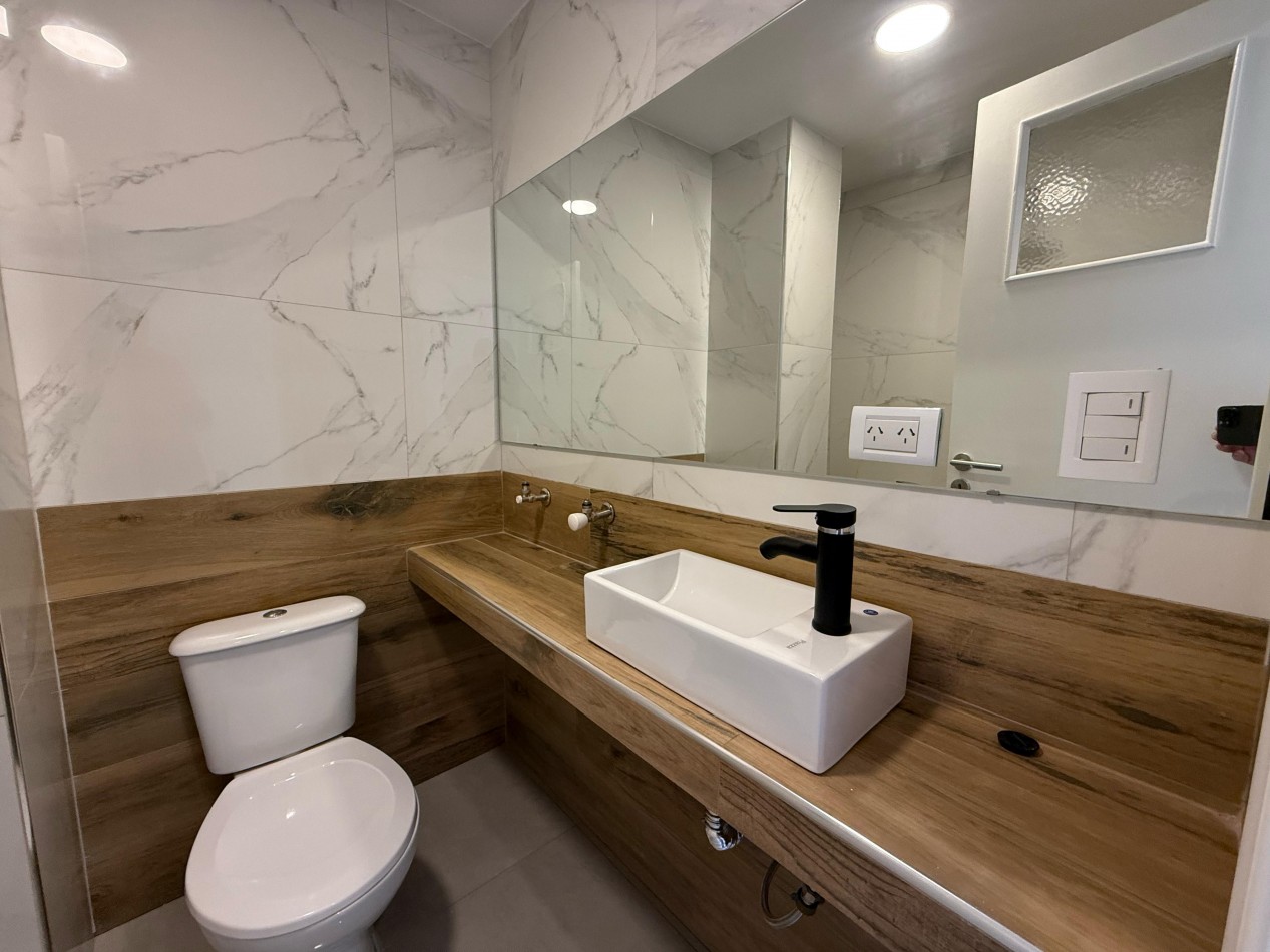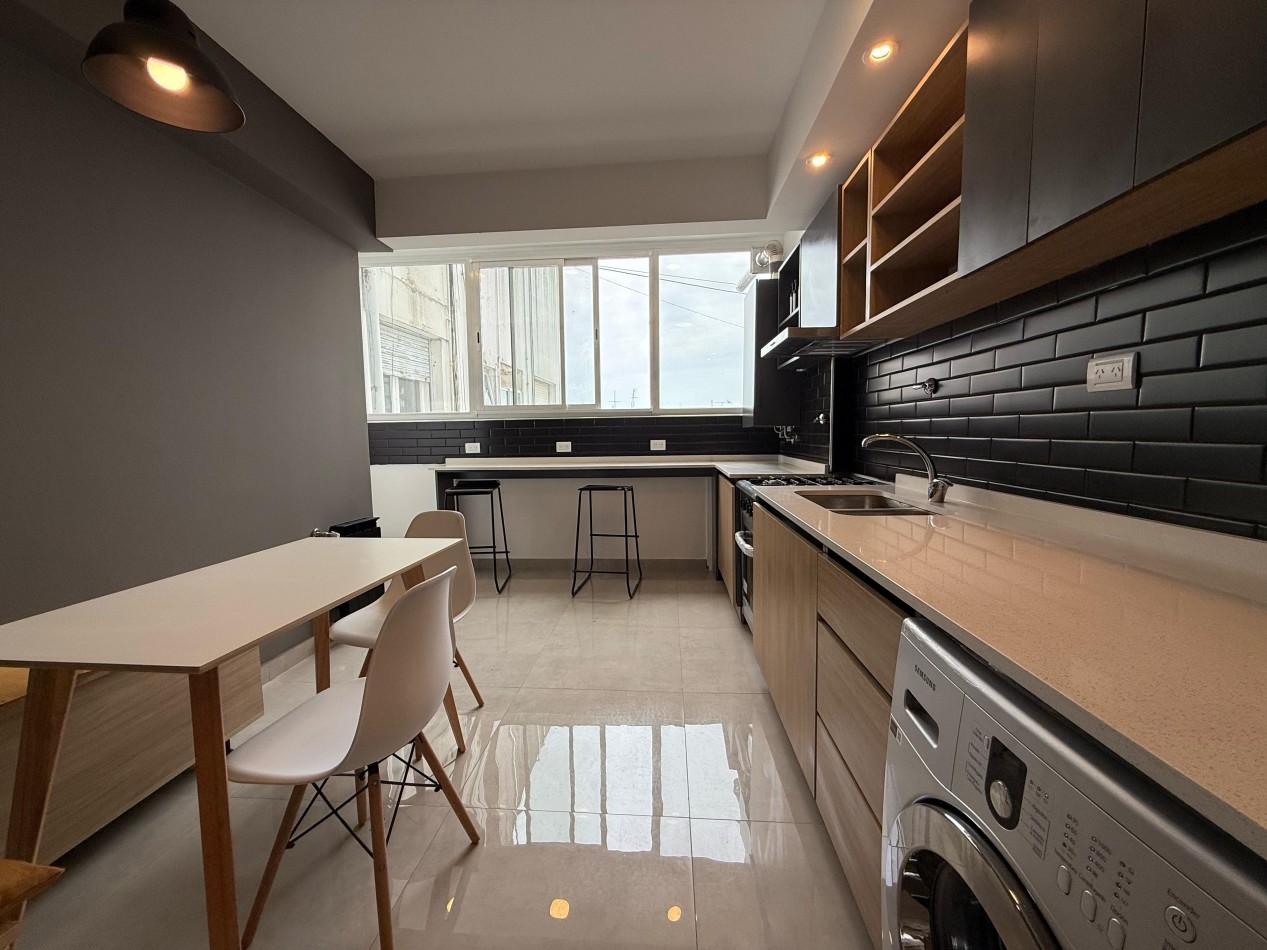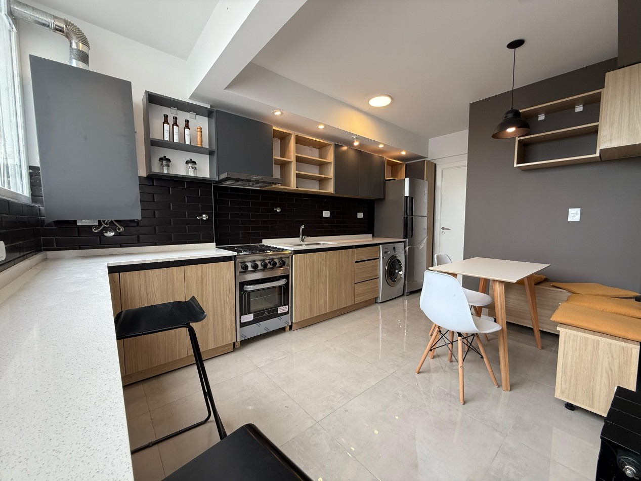 Cocina comedor separada, con ventilación natural, muebles a medida y desayunador. Equipada con artefacto de cocina en acero inoxidable, campana de extracción de olores, heladera con freezer y lavarropas instalado.