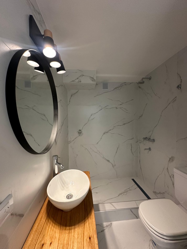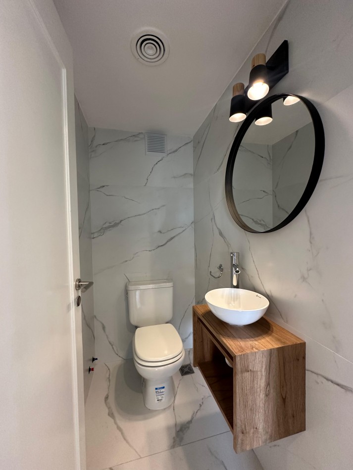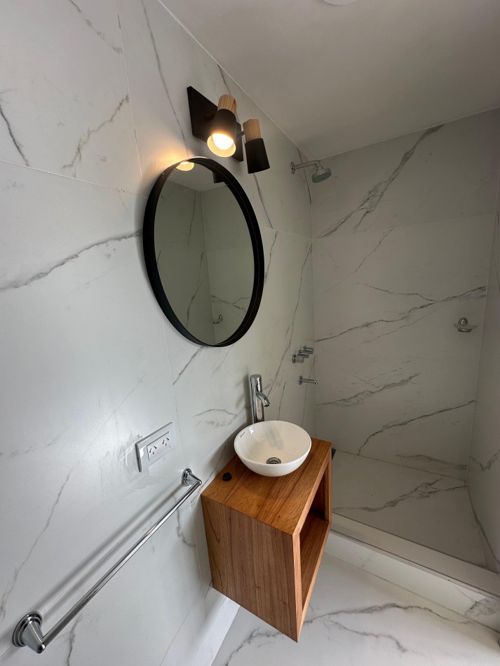 Dos baños con pediluvio, uno en suite, totalmente revestidos en porcelanatos.