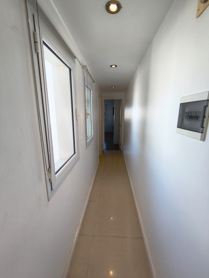 Un pasillo de distribución conduce al baño completo, con bañera, mampara de vidrio y ventilación natural.
