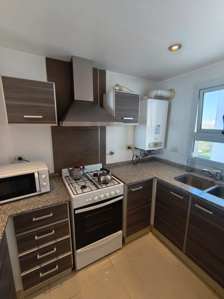 Cocina semi integrada con barra desayunadora, muebles a medida y ventilación natural. Equipada con artefacto de cocina, campana de extracción de olores y conexión para lavarropas.