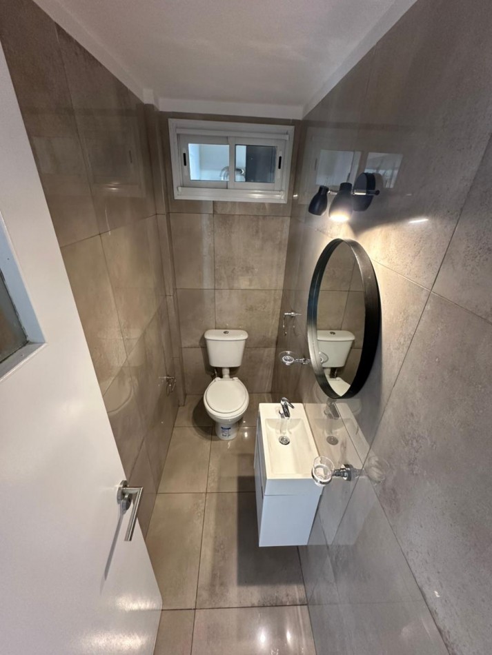Cocina integrada, revestida en porcelanatos, con barra desayunadora, ventilación natural y muebles a medida. Equipada con artefacto de cocina, heladera con freezer, caldera dual y lavarropas instalado.