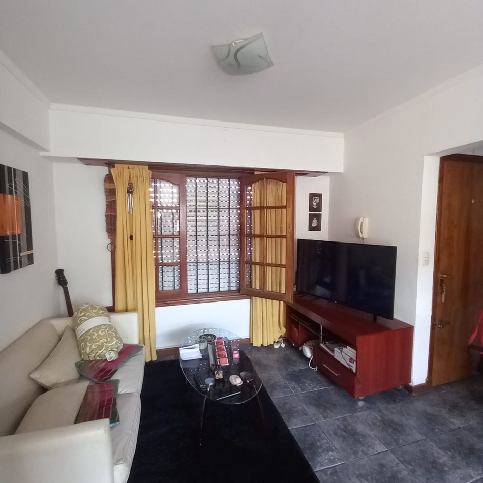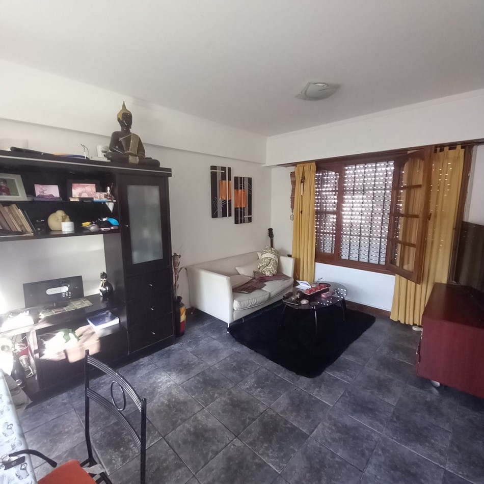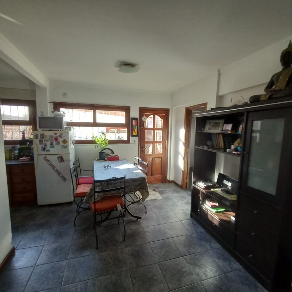 Living comedor con piso de cerámicos, ventanas hacia la calle y el patio trasero.