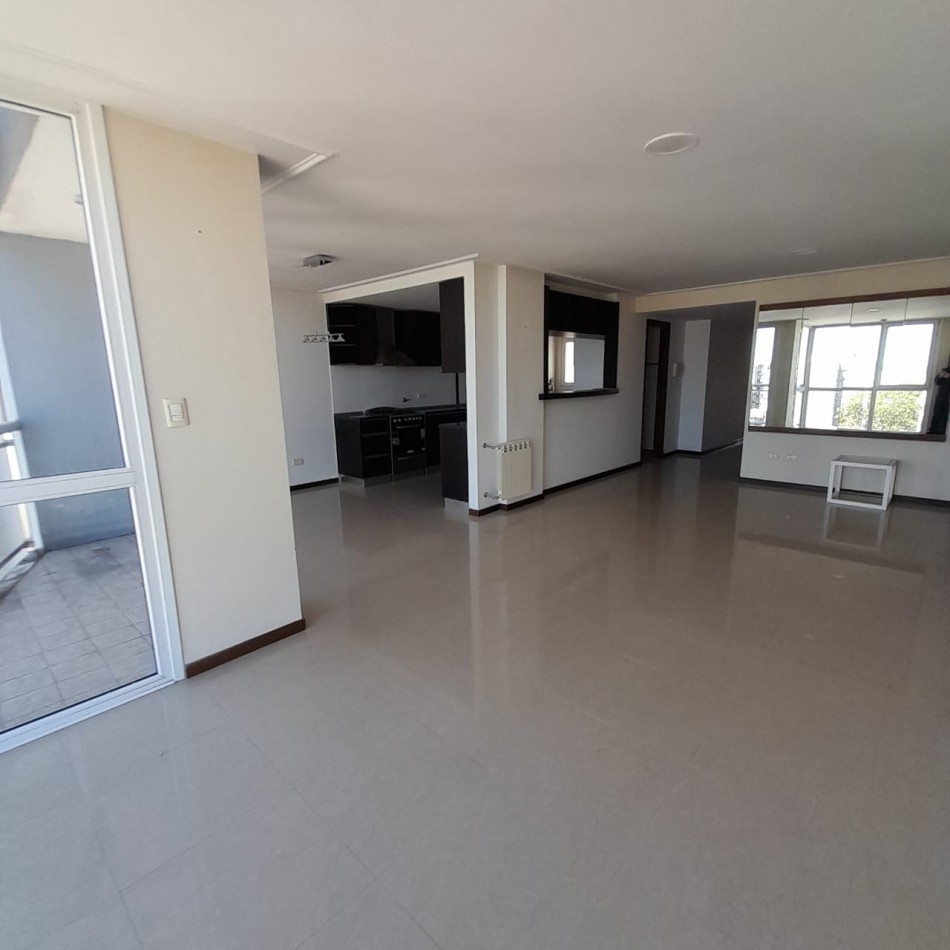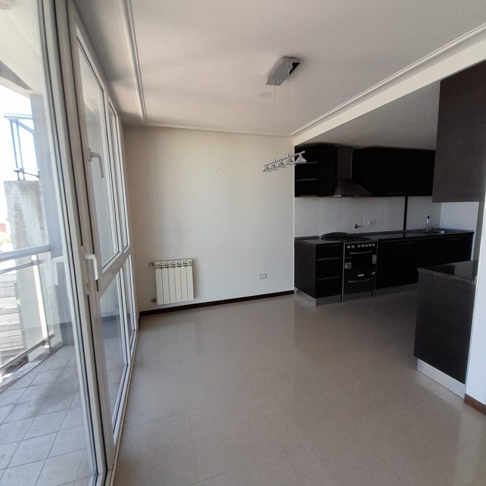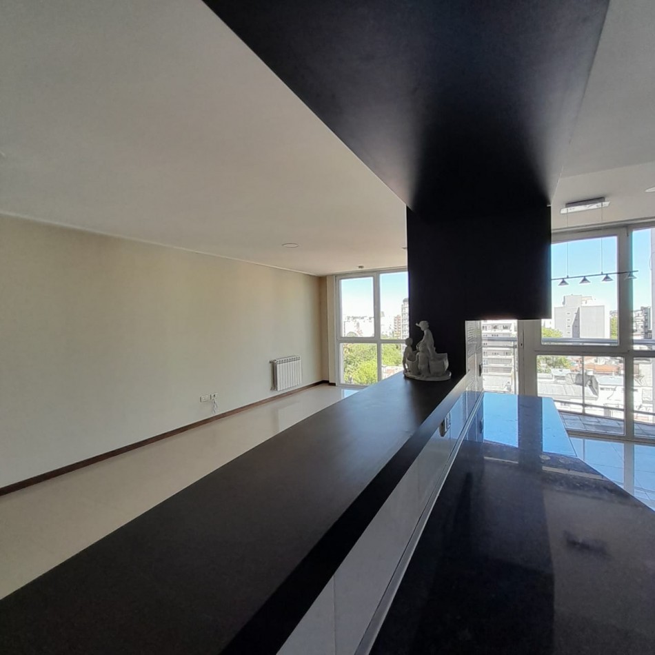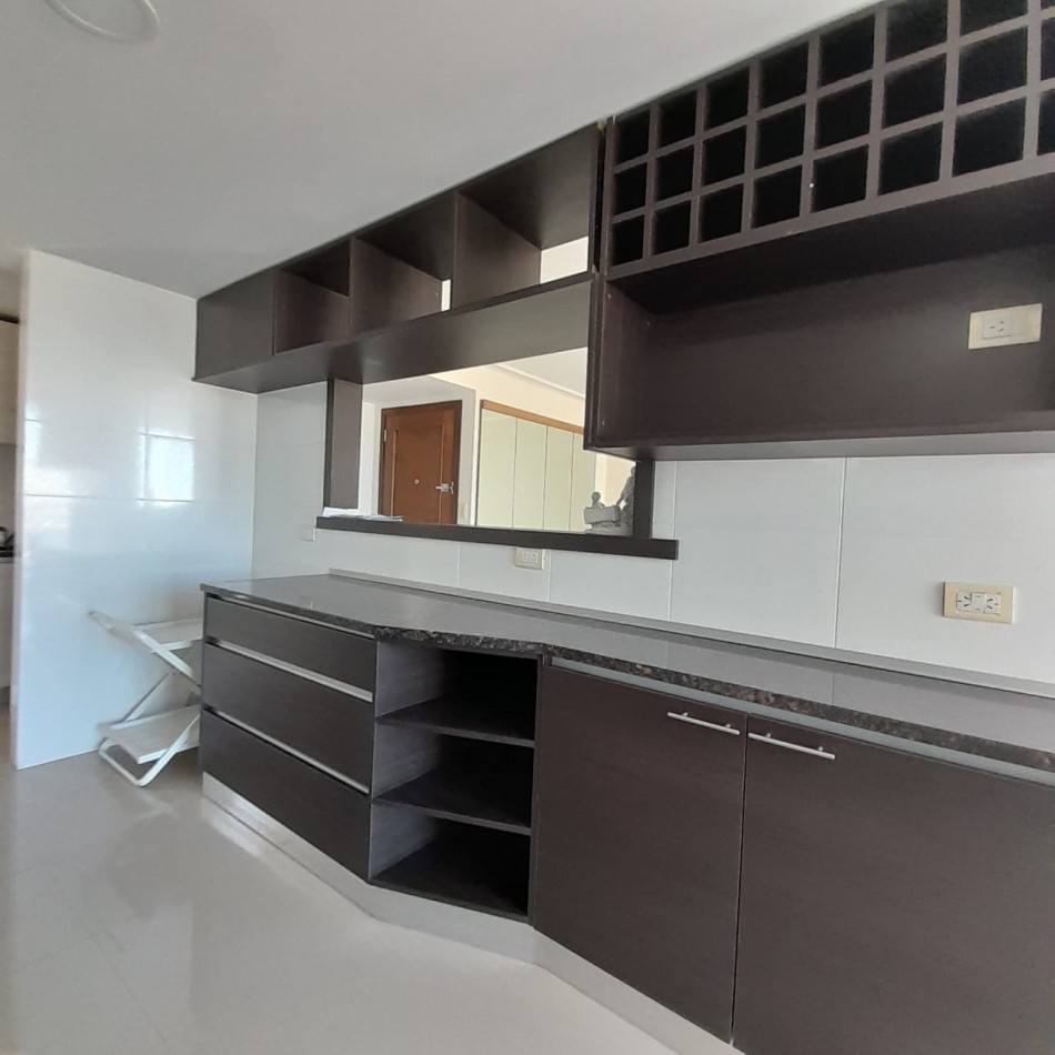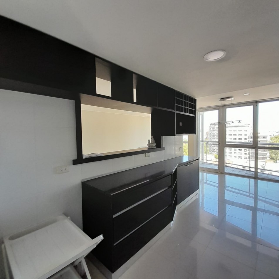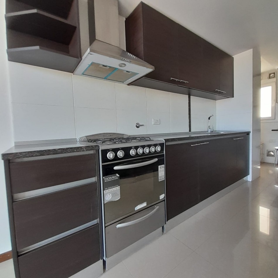 Cocina semi integrada, con barra y pasa platos hacia el comedor principal, y abierta hacia un espacio de comedor diario, que da hacia el balcón al frente. Es una cocina muy amplia, cómoda y luminosa, con doble mesada, muebles a medida sobre y bajo mesada que proporcionan gran lugar de guardado, cocina y campana de extracción de olores en acero inoxidable.