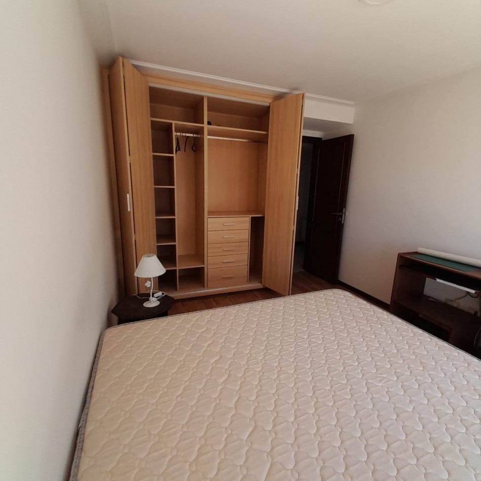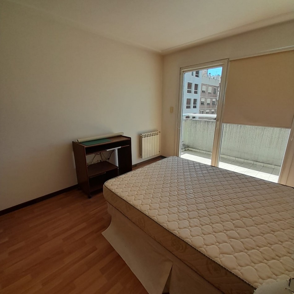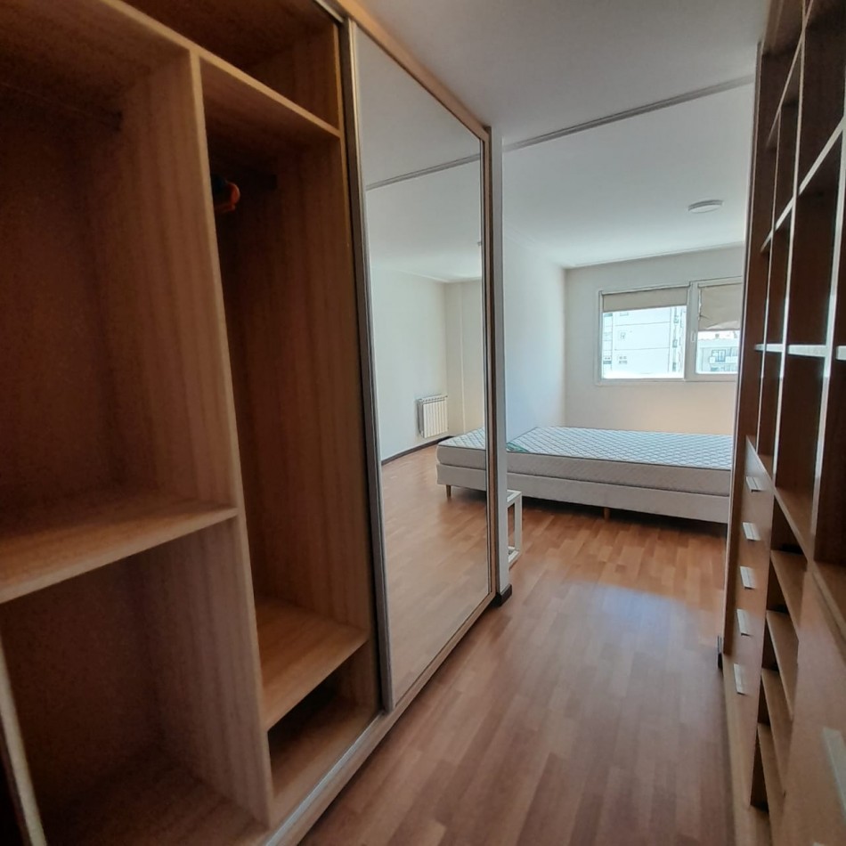 Un dormitorio con balcón hacia el contrafrente y con vista abierta, con gran placard empotrado y puertas plegadizas.